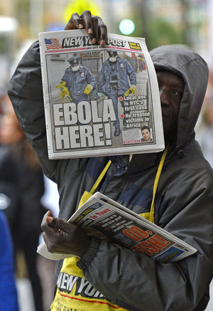 A newspaper vendor holds up a copy of the NY Post in New York the morning after it was confirmed that Dr. Craig Spencer tested positive for Ebola. Timothy A. Clary /AFP / Getty Images