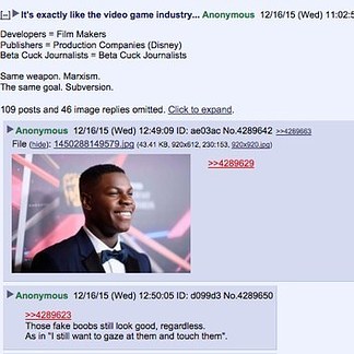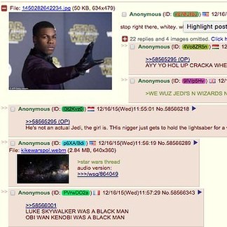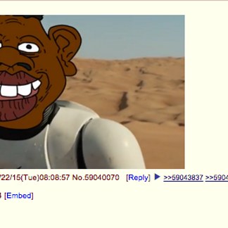 Boyega is a black actor with a lead role in Star Wars: The Force Awakens. By all accounts, he turns in a charming and sympathetic performance as Finn, a Stormtrooper with a conscience. But a lot of chan posters don’t seem interested in that. Rather, they’re angry he’s in the movie at all. In the story told through the jokes and jeremiads of dozens of chan posts, Boyega got the job not because of his qualifications as an actor, but because of a nefarious outside force located somewhere between affirmative action and liberal conspiracy, a foreign hand unnaturally pushing cultural diversity into the natural state of pop culture. His presence is seen as an invasion.