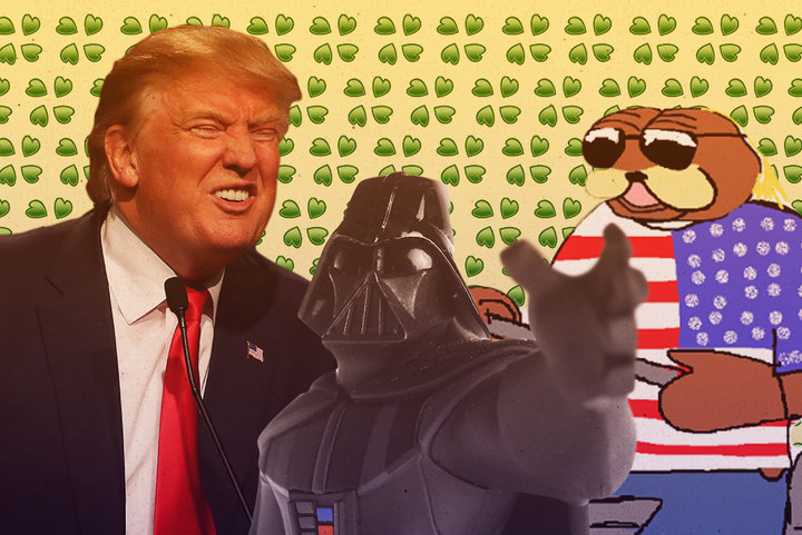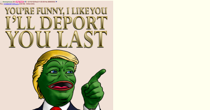 But this year Chanterculture found its true hero, who makes it plain that what we’re seeing is a genuine movement: the current master of American resentment, Donald Trump. Everywhere you look on “politically incorrect” subforums and random chans, he looms. Beneath literally every page on 8chan lurks Trump’s face, which, as Elspeth Reeve put it wonderfully, is “very good to look at.” It is the avatar of Chanterculture. A feverish industry of meme-making has grown up around its contours. It has even, at times, subsumed Pepe.