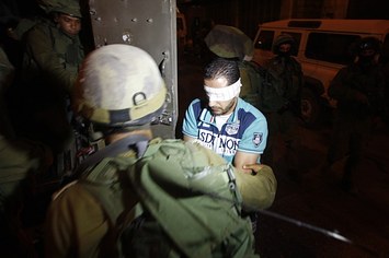 Israeli soldiers detain a blindfolded Palestinian in the West Bank City of Hebron, July 2, 2014. Mussa Issa Qawasma / Reuters
