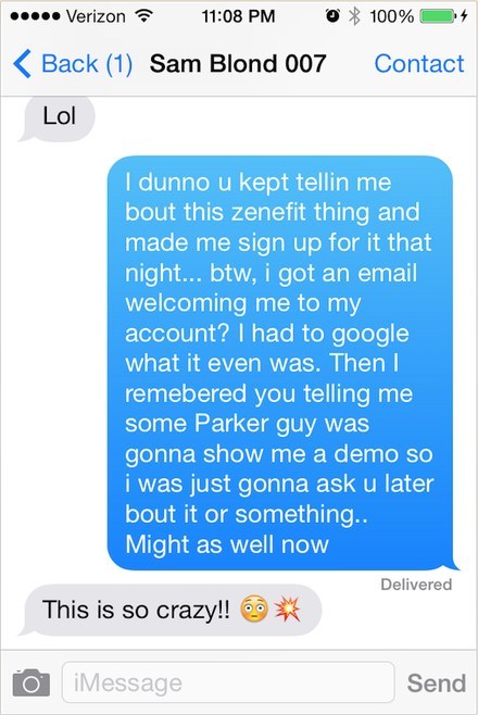 “I dunno u kept tellin me bout this Zenefit thing and made me sign up for it that night…,” she texted him later, saying she had received a welcome email from the company. “Then I remembered you telling me some Parker guy was gonna show me a demo.”