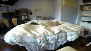 At first he positions himself so that he's facing the wall. A good choice for the morning.