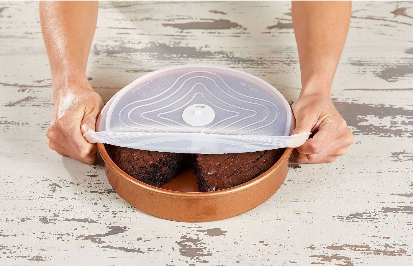 10. A silicone stretch lid cover that fits over bowls, cups, glassware, jars, and even fruits and vegetables to keep freshness in and plastic wrap out.