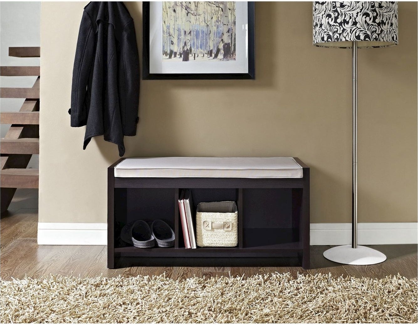 24. An entryway bench people may think is just super nice decor but it's actually a super sneaky way to add some more storage shoes, hats, and gloves that accumulate by the door.