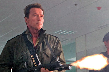 The holy trinity of action stars (Schwarzenegger, Stallone, and Willis) in the same scene, all shooting guns together. The Expendables is officially the manliest film ever made and it hits theaters on August 17.