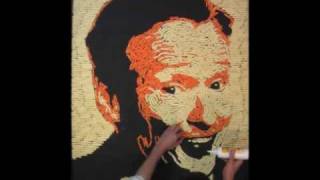 Artwork made entirely with Cheetos (and a little glue). Over 50 bags of different flavors used to sort different colors, sizes, and shapes. Nearly 2,000 individual Cheetos are used to create the portrait, all held into place with a little glue and varnish.