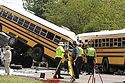 Two buses carrying high school band students to an amusement park Thursday slammed into a freeway wreck that happened right in front of them, crushing a pickup truck and killing its driver and one of the students. Dozens of other students were treated for injuries.