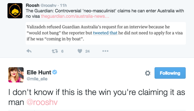 Valizadeh is unlikely to try to come to Britain soon. He is currently attempting to enter Australia, but is unlikely to be granted access, as BuzzFeed News reported on Monday. He told the Guardian that he doesn't need a visa if "entering by boat", but what he meant is unclear. He went on to decline an interview with the paper's reporter on the grounds that he "would not bang" her.