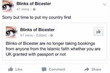 “Blinks of Bicester are no longer taking bookings from anyone from the Islamic faith whether you are UK granted with passport or not” and added, “Sorry but time to put my country first.”