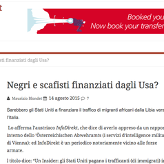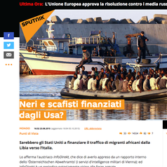 The TzeTze post linked back to the original version of the story published on Sputnik Italia, which went on to claim the refugee crisis was not being driven by people fleeing war in Syria and elsewhere, but by deliberate US strategy. Sputnik in turn had picked up the story, which originated in a far-right publication, from the blog of a right-wing former Italian journalist who claims 9/11 was an inside job and whose diatribes are often picked up and reported as fact by TzeTze and Sputnik. The headline on this blogpost: “Niggers and smugglers”.