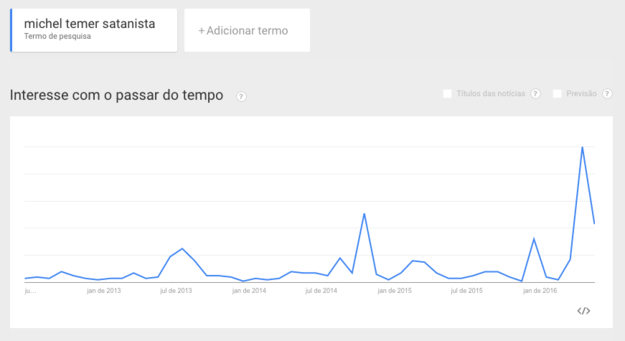 5. As pessoas parecem interessadas pelo assunto. Os termos “Michel Temer satanista” foram muito buscados durante as eleições de 2014 e atingiram o ápice em abril deste ano, com o processo de impeachment da Dilma.