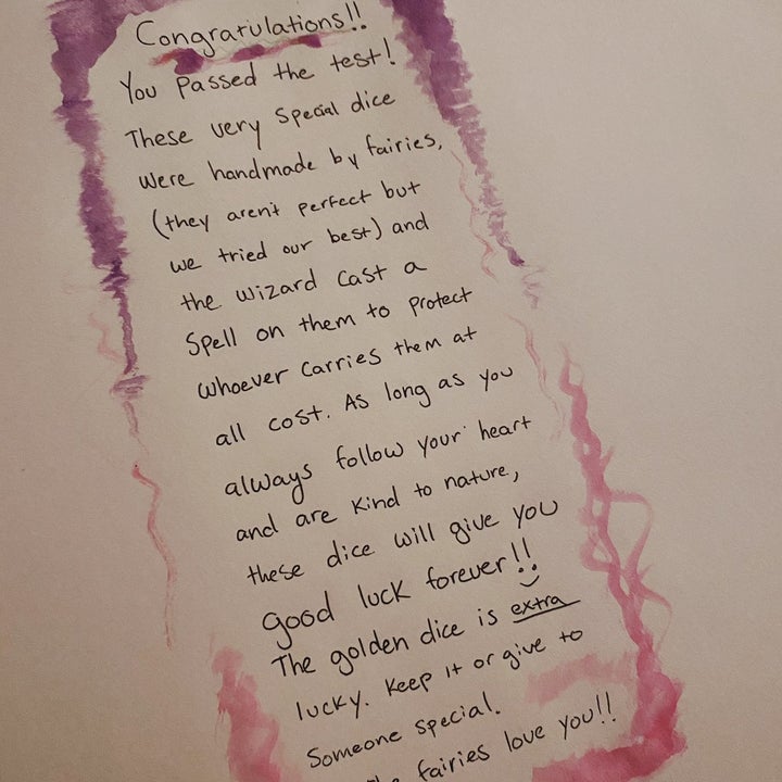 "I wrote a little note to her, pretending to be a fairy named Sapphire that had come to live in the tree because she had set it up so nicely and I left it on the tree that night on my walk and said I would gift her with a magical fairy dice if she did 3 things for me," Kelly wrote on Twitter.