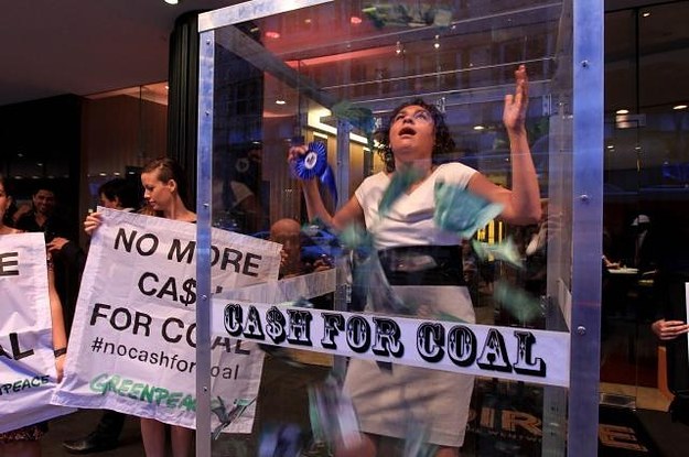 Protesters in penguin onesies went up and down the escalators saying "coal prices are going down!" while guests looked on and sipped champagne under the giant chandelier at the Sofitel.