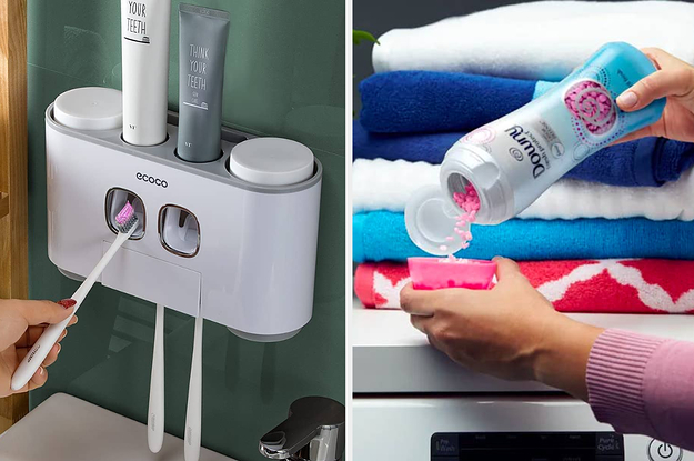 9. A toothbrush holder with two built-in automatic toothpaste dispensers that'll take your oral hygiene routine to the next level. It comes with four mouthwash cups and has five toothbrush slots, so it'll also help declutter your counter.