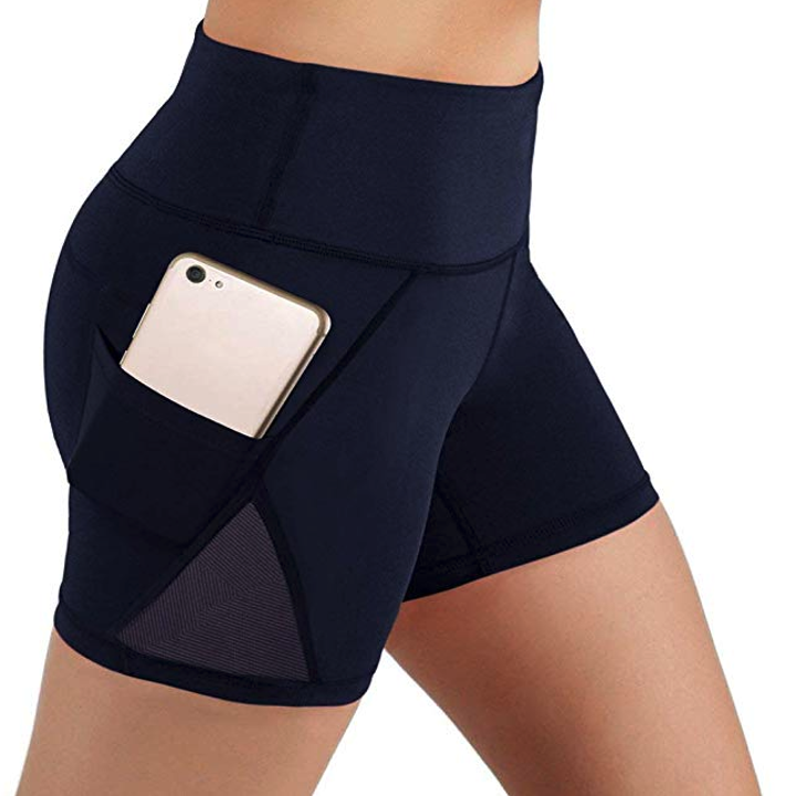 22. A pair of high-rise, pocketed shorts that'll save you from having to wear a fanny pack or bulky armband on your run. The compression design saves them from rolling up your thighs while you work out (an absolute necessity).
