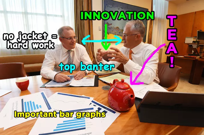 Here's prime minister Malcolm Turnbull and Morrison preparing their first Budget in 2016. Working hard, hydrating, and having some classic maths chats.