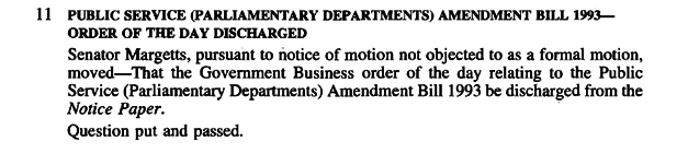 This is only the second time in 30 years the ruling government has lost control of the Senate notice paper. The last was in 1995 when former Greens senator Dee Margetts had a bill struck from Senate business.