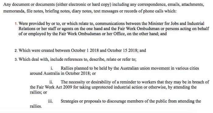 The FOI request seeks any communications between the minister and FWO that mention "strategies or proposals to discourage members of the public from attending [union] rallies" or "the necessity or desirability of a reminder to workers that they may be in breach of the Fair Work Act 2009 for taking unprotected industrial action or otherwise, by attending the rallies".