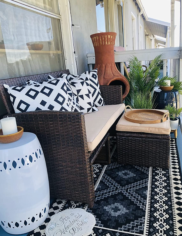 This set comes with a loveseat, and ottoman, and a side table. It's made with UV protected wicker so you can forgo worrying if the color will fade in the sun.