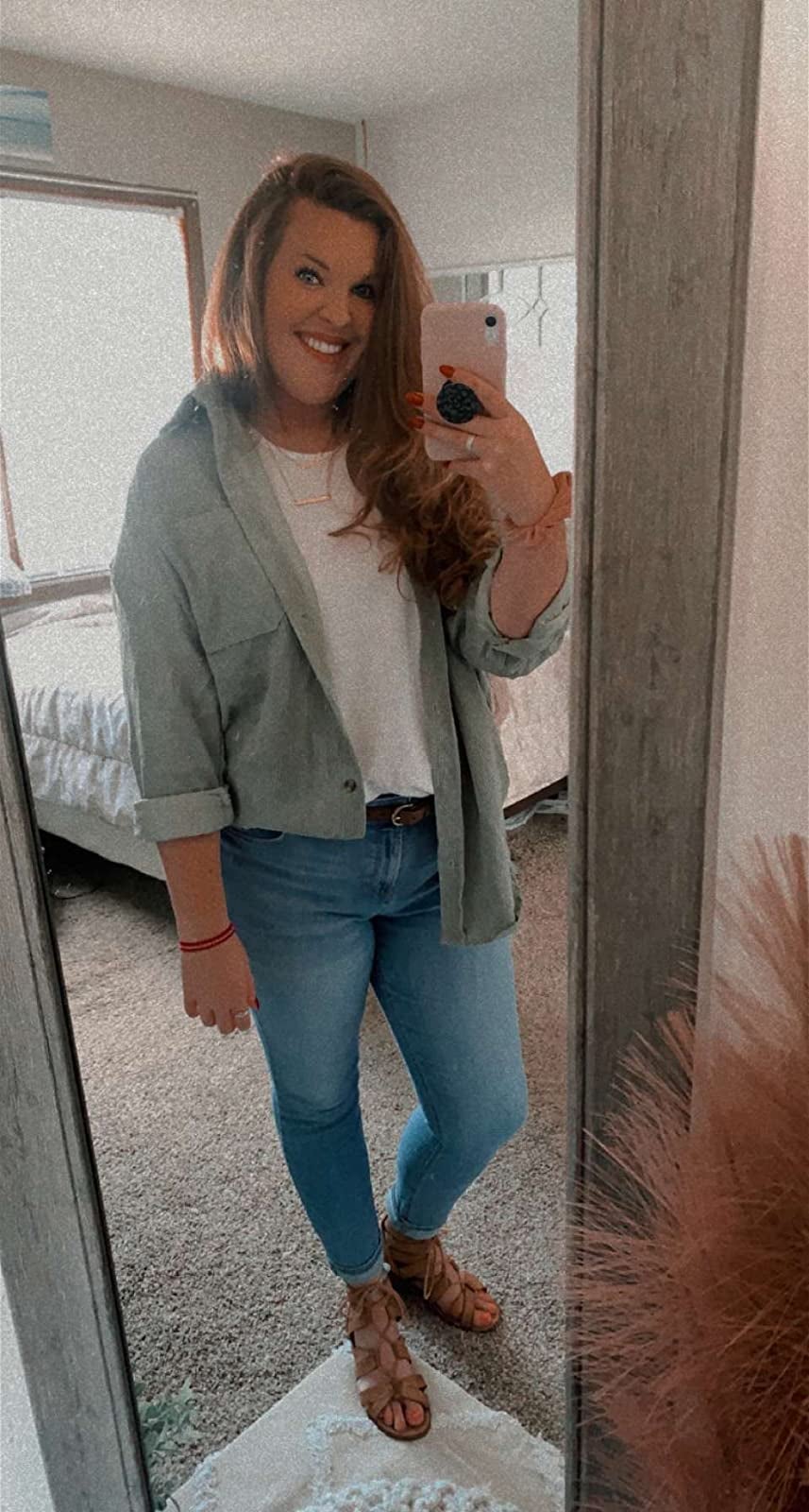 "I was looking for the perfect shacket last year and found this one. It did not disappoint! I have it in dirty olive and stone and wear them all the time. I live in the Midwest and can wear this year round. It's perfect to throw on over anything, my favorite is jeans and a basic tee. It's definitely oversized but that's what I love about it. Will be buying more colors for fall!" —liiilyhansen