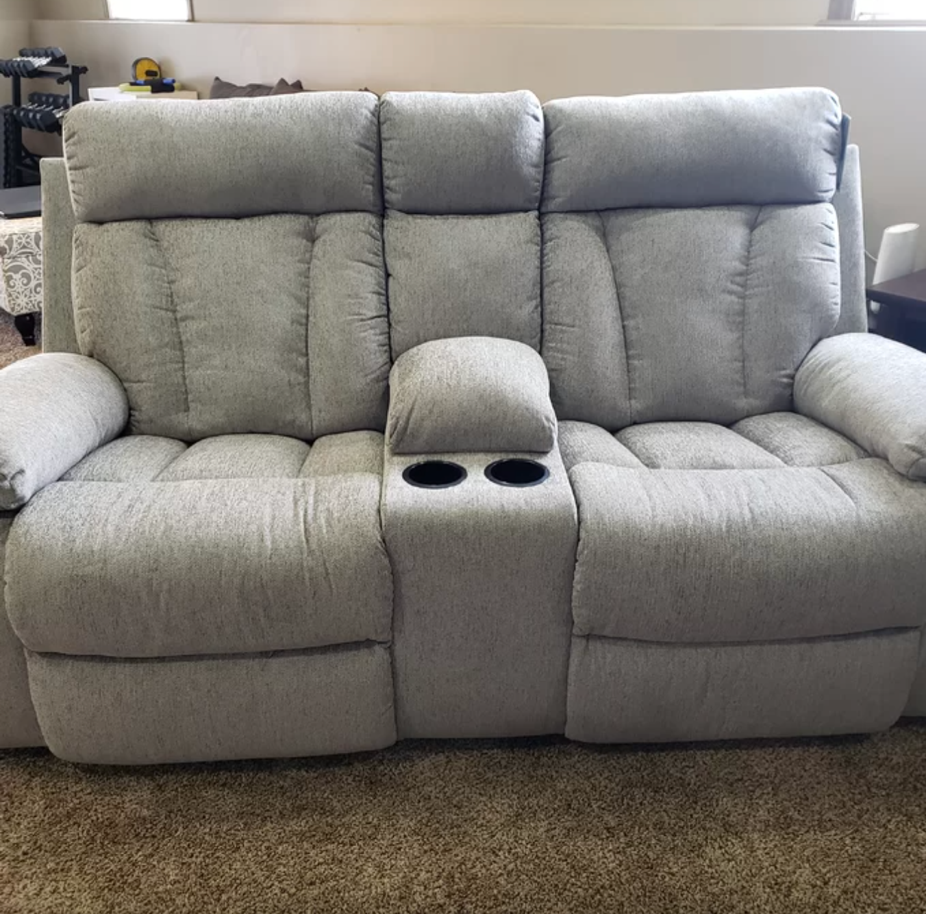 Promising review: "We love this couch! Very comfy, perfect size for an apartment as it's a little smaller than a typical full sofa. The recliners are great, and the tray in the middle was something I didn't know I needed till I had it!" —Alayna