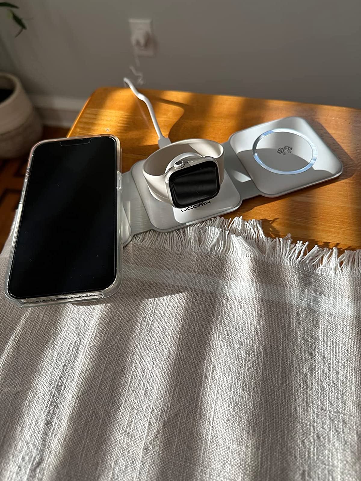 Promising review: "I needed a charger that would be great for traveling. It’s very useful when packing. I was bringing three chargers around with me — this is great because it’s three in one! Definitely worth the buy not to mention I have MagSafe and it secures my phone while charging so I don’t have to worry about my phone slipping off and not charging. I’ve had instances where I bought the chargers that you lay your phone on and you have to place it a certain way to charge. This one magnetically secures with MagSafe which I love!" —Emily