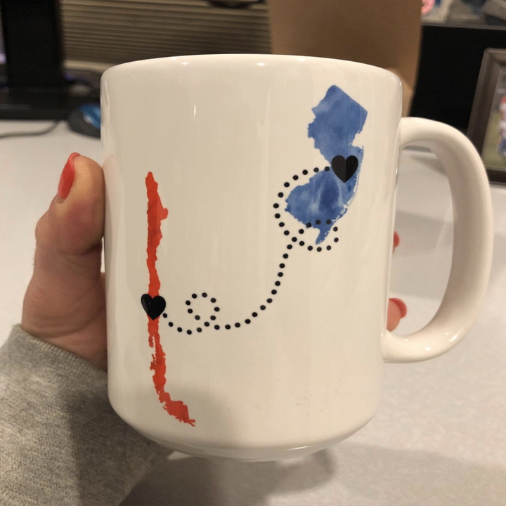 1. A ceramic mug that can be personalized with two different states on the front and a sappy message in the back to signify that while you may not be close geographically, you *are* in each other's hearts.