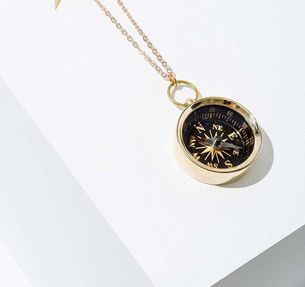 23. A pendant necklace designed with a brass compass pointing in the direction of your shopping cart. Will you *actually* give this as a gift? Of course! You just want to try it on first, wear it for a few months, make sure it's good enough to gift, etc.