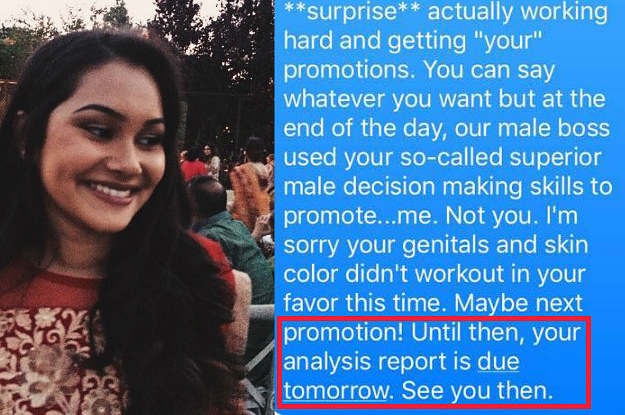 Rahman told BuzzFeed that she decided to reply to this message because she has faced sexism in the workplace before.