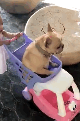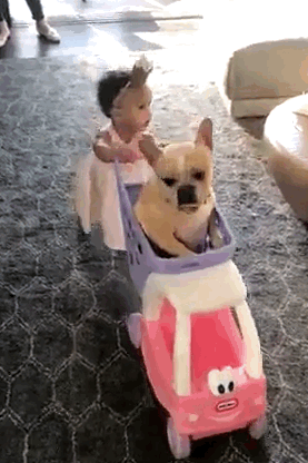 ...by PUSHING THEIR FRENCH BULLDOG AROUND IN A STROLLER.