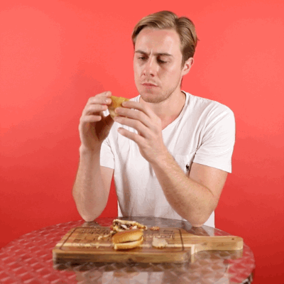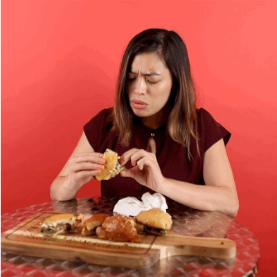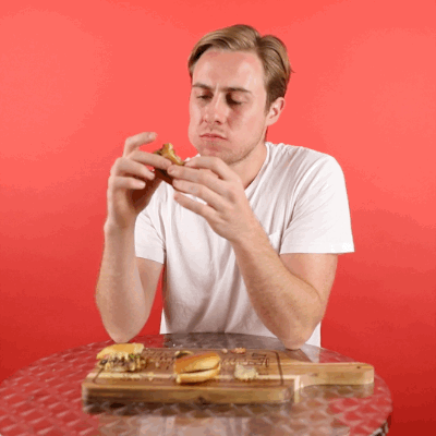 Brad: This has a weird, orange, oily sauce on it, which isn't appealing in any way. It's... uhhh, it's really not good. It didn't taste like anything. The sauce is not nice, the burger is just chewy. You can't taste meat, you just chew. And it's weirdly sweet.