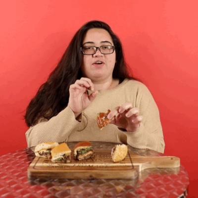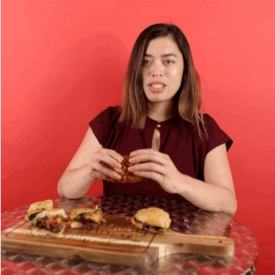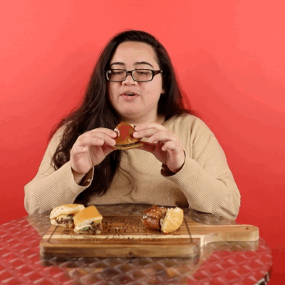 Mat: Oh, she's a messy one! That's really... ummm... wet? It's sloppy at the bottom. The pattie is fine, but there's too much sauce. The bottom bun looks like a used Band-Aid. Nah.