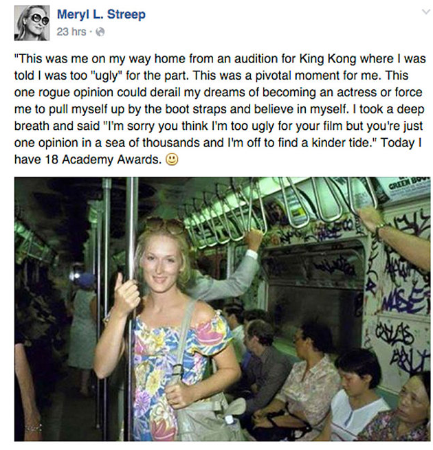 This was me on my way home from an audition for King Kong where I was told I was too “ugly” for the part. This was a pivotal moment for me. This one rogue opinion could derail my dreams of becoming an actress or force me to pull myself up by the boot straps and believe in myself. I took a deep breath and said “I’m sorry you think I’m too ugly for your film but you’re just one opinion in a sea of thousands and I’m off to find a kinder tide.” Today I have 18 Academy Awards. 😊