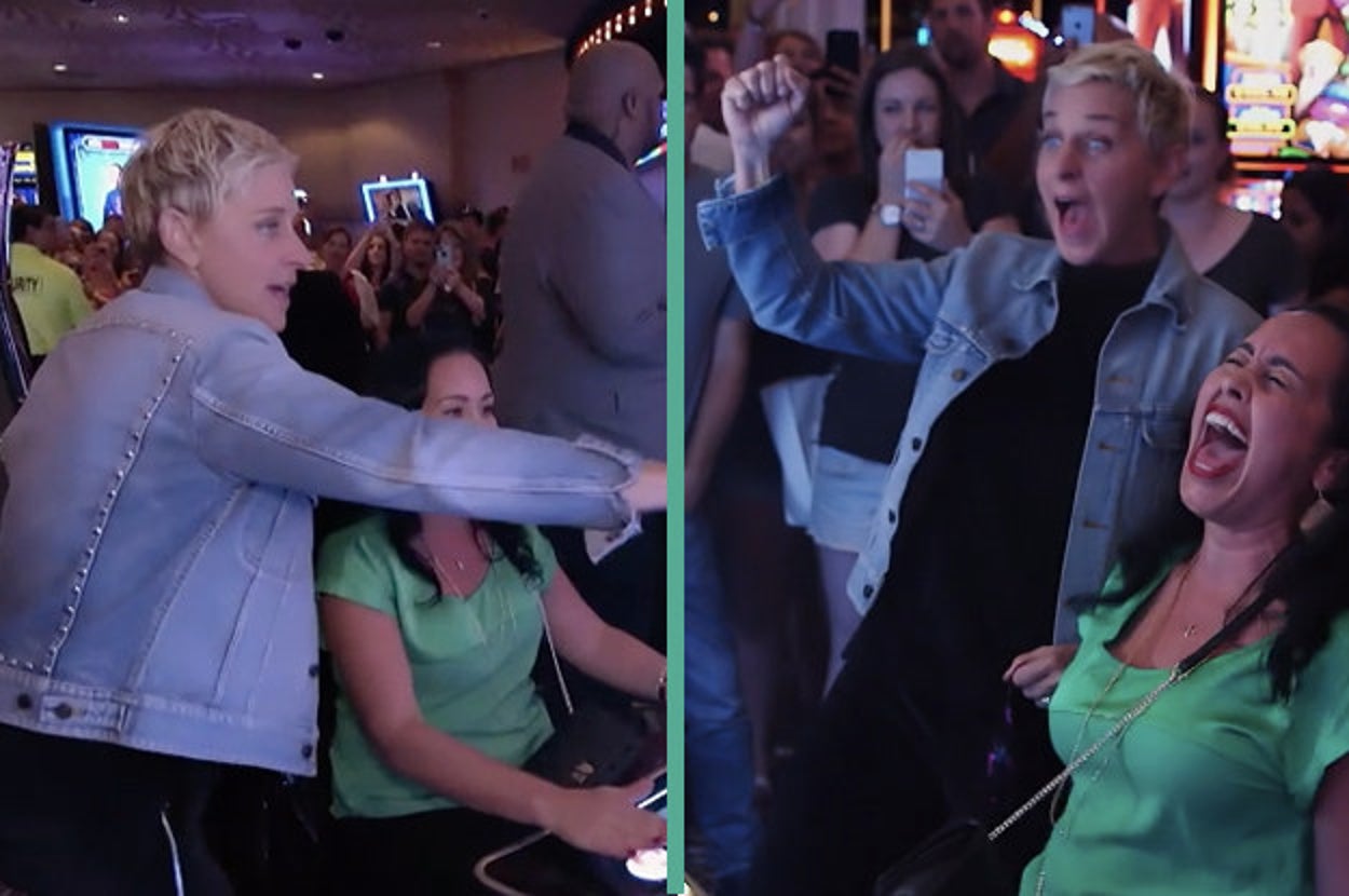 Well, these people won the jackpot of life because our reigning queen of the universe, Ellen DeGeneres, decided to surprise them while they were playing her slot machines.