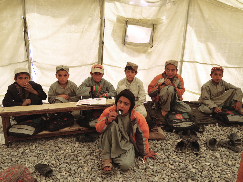 But in an unannounced visit to the school this March, not a single girl was in attendance. Instead, the seven tents that made up the school were filled with boys, some of whom had no chairs or desks. They sat on rocky ground, fading backpacks emblazoned with the Afghan flag next to them.