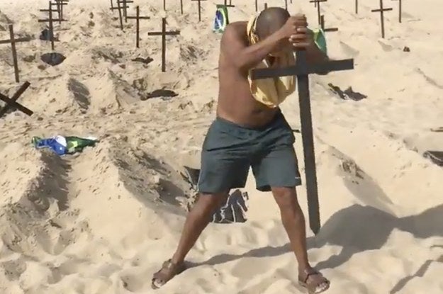 ONG Rio de Paz abriu cem covas na praia de Copacabana para simbolizar os mortos pelo coronavírus. E um homem derrubou as cruzes que ficavam diante delas.