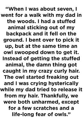 "My mom and I went to an emu farm when I was 14. We went into the enclosure and an emu came up to me and its neck began to turn turquoise. That’s the color their necks turn when they’re sexually aroused and want to mate. So it wraps its long-ass, strong neck around my body and starts, well, humping me. It keeps yelling/hissing at anyone who comes near and not letting go of me. This lasted for about four minutes until the owner of the farm and my mom were able to get it off of me."