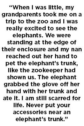 "It lunges for me, and I throw myself backwards, colliding full throttle with the sinks. I fall to the ground as the buck tears out of the stall, and I roll out of the way just time. So I’m sitting under the sink absolutely horror-struck when a whole bunch of counsellors come bursting in to find me sitting in my own pee, crying and shaking with bruises forming on my back and head."
