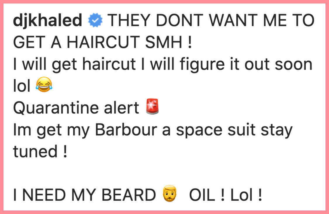 Yep, Khaled joked on Instagram that his hair and beard had grown out a little more than usual thanks to the fact he can no longer see his barber while the lockdown is in effect.