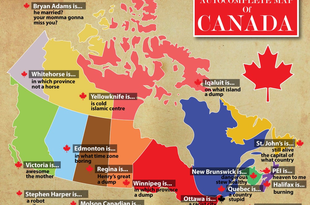 We typed ____ is into Google and reproduced the best auto-complete results onto this handy map of Canada.