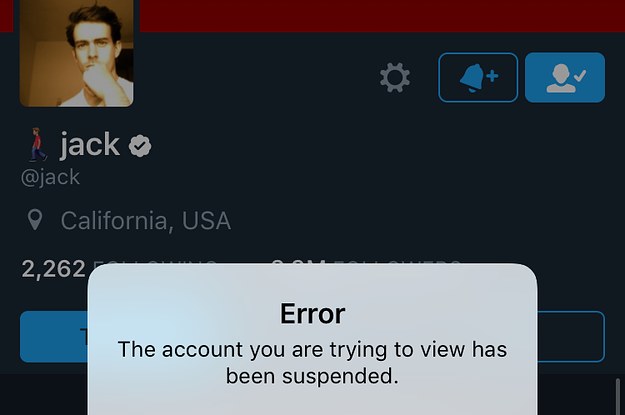 Por um breve período, esta foi a mensagem exibida no lugar da timeline normal de @jack: "A CONTA QUE VOCÊ ESTÁ TENTANDO VER FOI SUSPENSA".