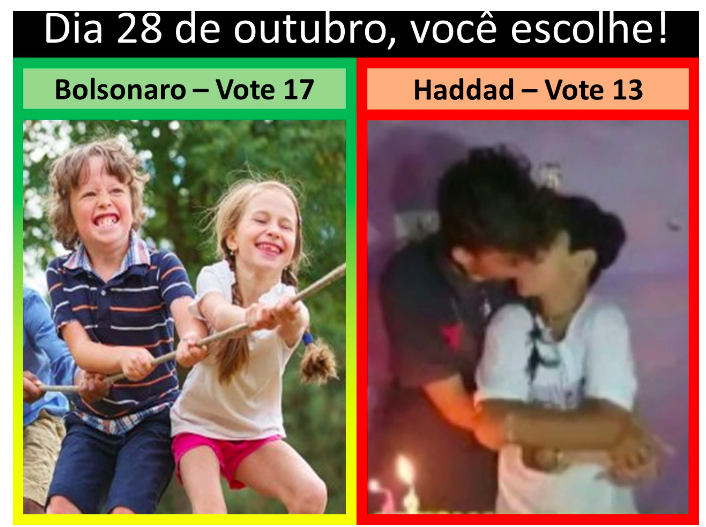 Uma das peças é bastante apelativa: opõe crianças brincando abaixo do "Bolsonaro – Vote 17" e dois adolescentes do mesmo sexo se beijando sob a divisa "Haddad – Vote 13." Como na foto abaixo: