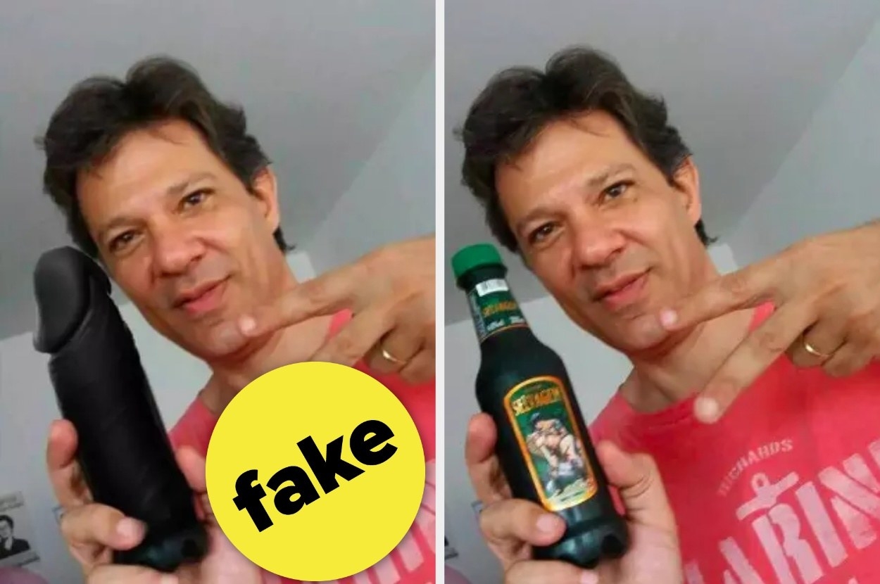 Outra fake news bastante é a montagem de uma foto em que o candidato do PT aparece segurando um brinquedo sexual. Na foto original, Haddad segura uma garrafa de catuaba.