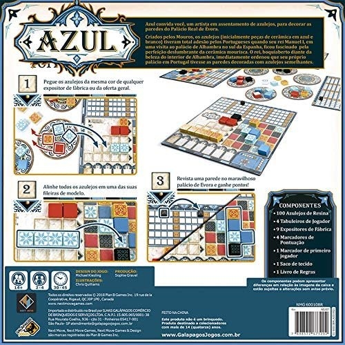 A descrição oficial do jogo: ""Azul" convida você para redecorar as paredes do Palácio Real de Évora em um jogo de estratégia onde os participantes são assentadores de azulejo. A cada rodada, os jogadores se alternam escolhendo os azulejos que serão usados e após sua colocação, sua pontuação é definida. A ordem da disposição dos azulejos determinam a quantidade de pontos, por isso é importante ser estratégico ao escolher. Vencedor do prêmio de Jogo do Ano (Spiel des Jahres) em 2018 e no topo de rankings de família e estratégia abstrata, "Azul" conquistou a crítica especializada e o público geral."