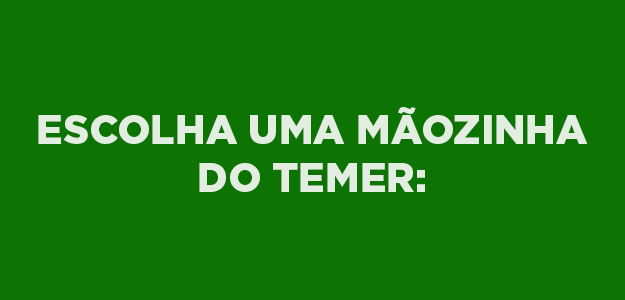 Answer Image Botox Correct Incorrect Botox Answer Image Uma peruca Correct Incorrect Uma peruca Answer Image Uma mala de dinheiro, sem dinheiro Correct Incorrect Uma mala de dinheiro, sem dinheiro Answer Image Uma arminha de brinquedo Correct Incorrect Uma arminha de brinquedo Answer Image Lavagem de dinheiro Correct Incorrect Lavagem de dinheiro Answer Image Associação criminosa Correct Incorrect Associação criminosa Answer Image Corrupção passiva Correct Incorrect Corrupção passiva Answer Image Mentir pra mãe Correct Incorrect Mentir pra mãe Answer Image Michel Temer Correct Incorrect Michel Temer Answer Image Sérgio Moro Correct Incorrect Sérgio Moro Answer Image Heráclito Fortes Correct Incorrect Heráclito Fortes Answer Image José Serra Correct Incorrect José Serra Answer Image Correct Incorrect Answer Image Correct Incorrect Answer Image Correct Incorrect Answer Image Correct Incorrect Answer Image Dando tchau Correct Incorrect Dando tchau Answer Image Cumprimentando Correct Incorrect Cumprimentando Answer Image Apontando Correct Incorrect Apontando Answer Image Pegando o prêmio "Brasileiro do Ano" Correct Incorrect Pegando o prêmio "Brasileiro do Ano" Answer Image Bolsa Balenciaga preta Correct Incorrect Bolsa Balenciaga preta Answer Image Óculos Ray-Ban Wayfarer Correct Incorrect Óculos Ray-Ban Wayfarer Answer Image Sapatilha Tory Burch Correct Incorrect Sapatilha Tory Burch Answer Image Wii Fit Correct Incorrect Wii Fit Answer Image Coxinha de 1 kg Correct Incorrect Coxinha de 1 kg Answer Image Barca de estrogonofe Correct Incorrect Barca de estrogonofe Answer Image Pizza com frango assado no meio Correct Incorrect Pizza com frango assado no meio Answer Image Melancia grelhada Correct Incorrect Melancia grelhada