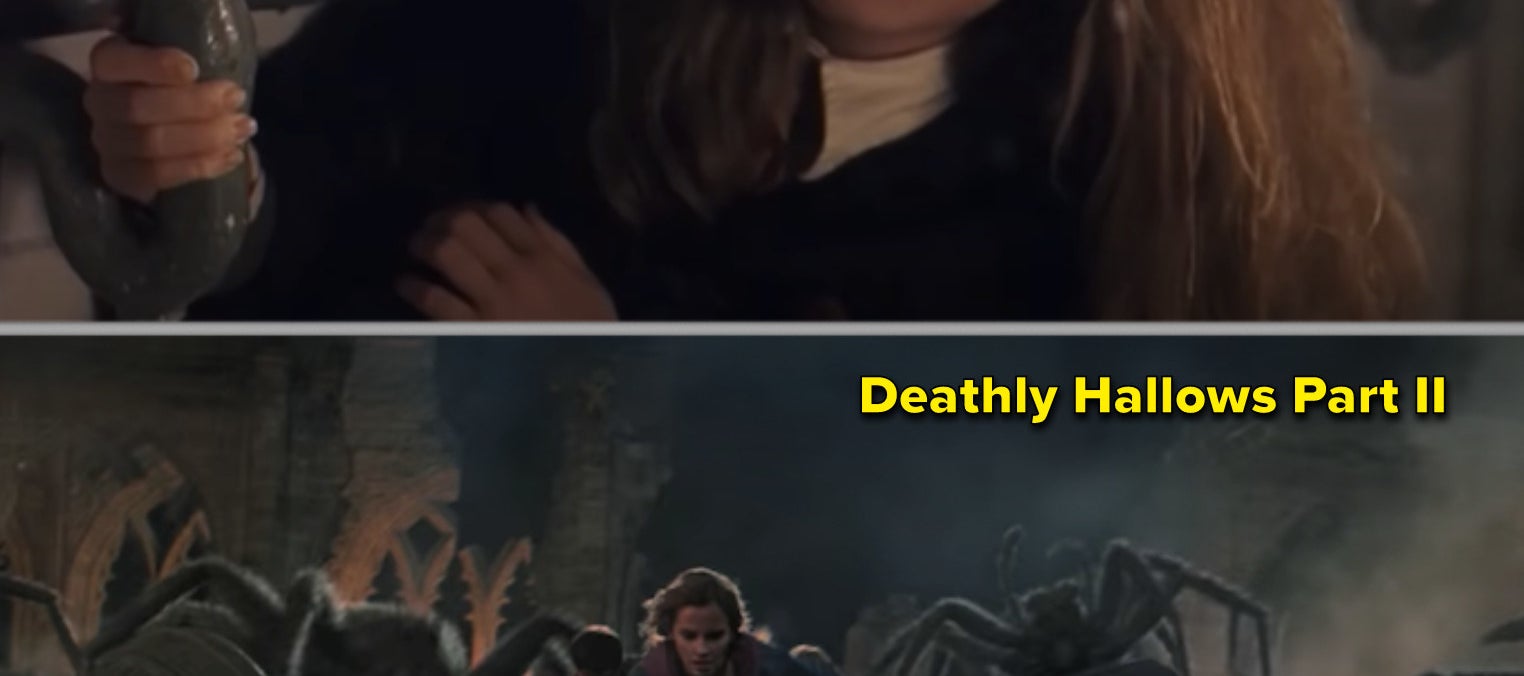 "Primeiro, uma criatura gigante tentou esmagá-los (imitando o primeiro filme quando Harry e Ron resgataram Hermione de um troll no banheiro). Depois, eles fugiram da descendência da aranha Aragogue, assim como quando Harry e Ron se depararam com as aranhas na floresta em 'Câmara Secreta'. Depois disso, Hermione lançou um feitiço no lobisomem, Fenrir Greyback (o lobisomem Lupin era obviamente enorme em 'Prisioneiro de Azkaban') e eles também lutaram contra Dementadores. Então, todos lutaram juntos, imitando a 'Ordem da Fênix'. Depois houve um corte para o Snape ('Enigma do Príncipe'). É tudo genial."