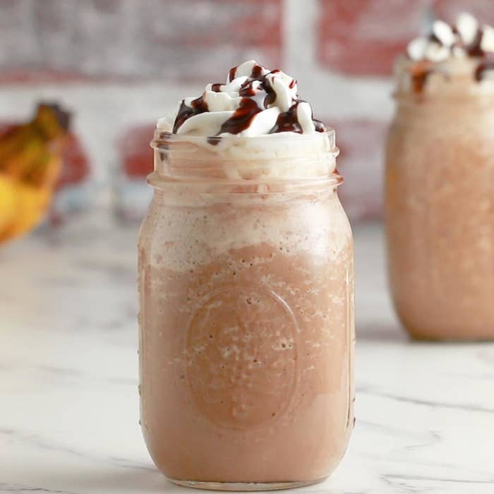 2. Coloque os cubos de gelo de café, a pasta de amendoim, o leite, a calda de chocolate e a banana no liquidificador. Bata até ficar homogêneo.