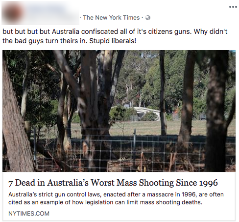 On Twitter and Facebook, pro-gun promoters used the Margaret River shooting to mock Australia's gun laws as well.