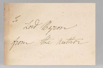 "I saw the book lying at an angle in the corner of the top shelf...I flicked idly back to the first blank that I saw the inscription in cursive black ink, 'To Lord Byron, from the author.'"