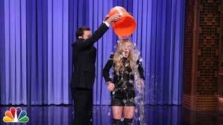 The starlet made a surprise visit to The Tonight Show, where her pal Jimmy Fallon doused her with ice water. All in the name of charity.